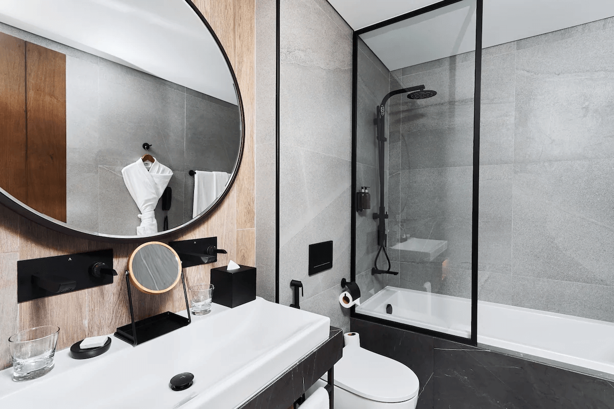 Our ultramodern glass bathroom is equipped with hairdryer, magnifying shaving and make up mirror as well as all the amenities you could possible need during your stay.